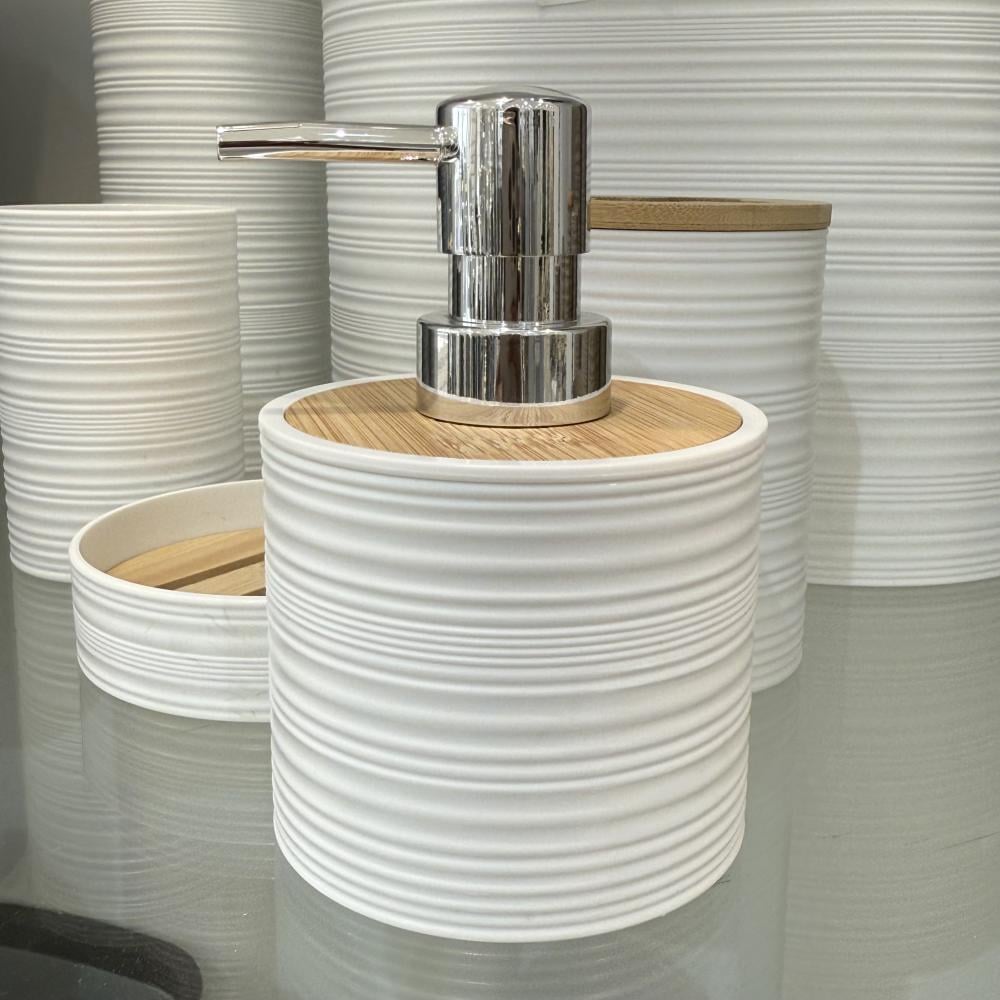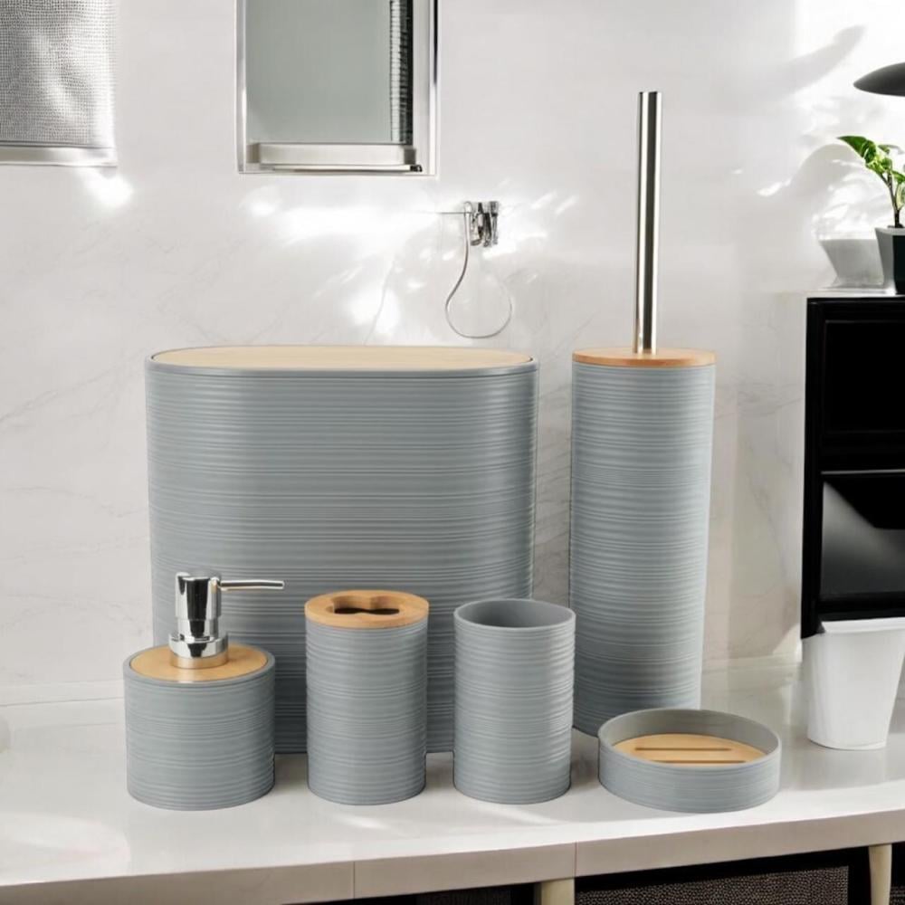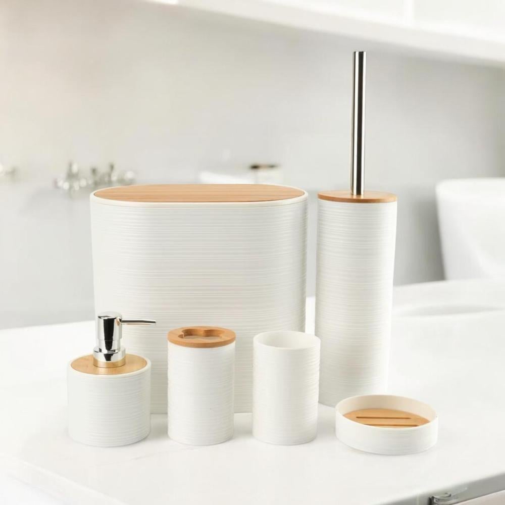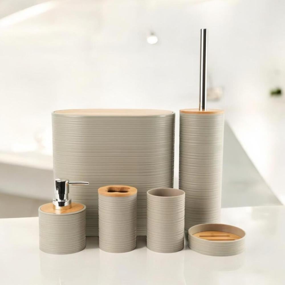 طقم حمام 6 قطع بلاستيك وخشب بتصميم عصري (أبيض / رمادي / بيج)
