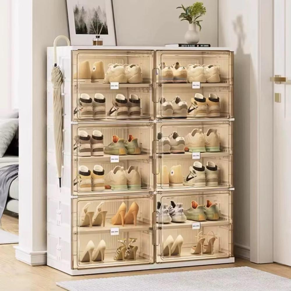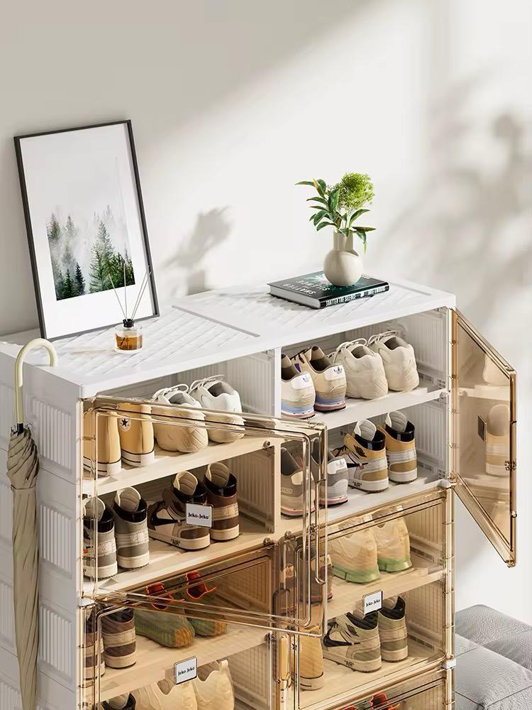 - تصميم الباب: أبواب شفافة بلون ذهبي ناعم تمنح مظهر عرض فاخر للأحذية مع حماية من الغبار.