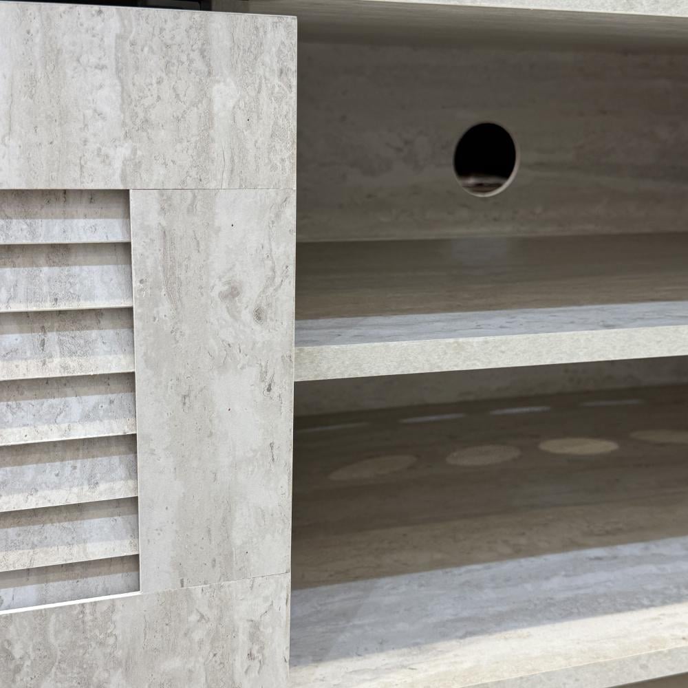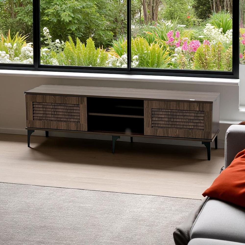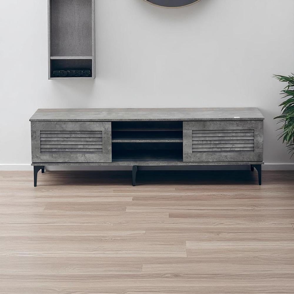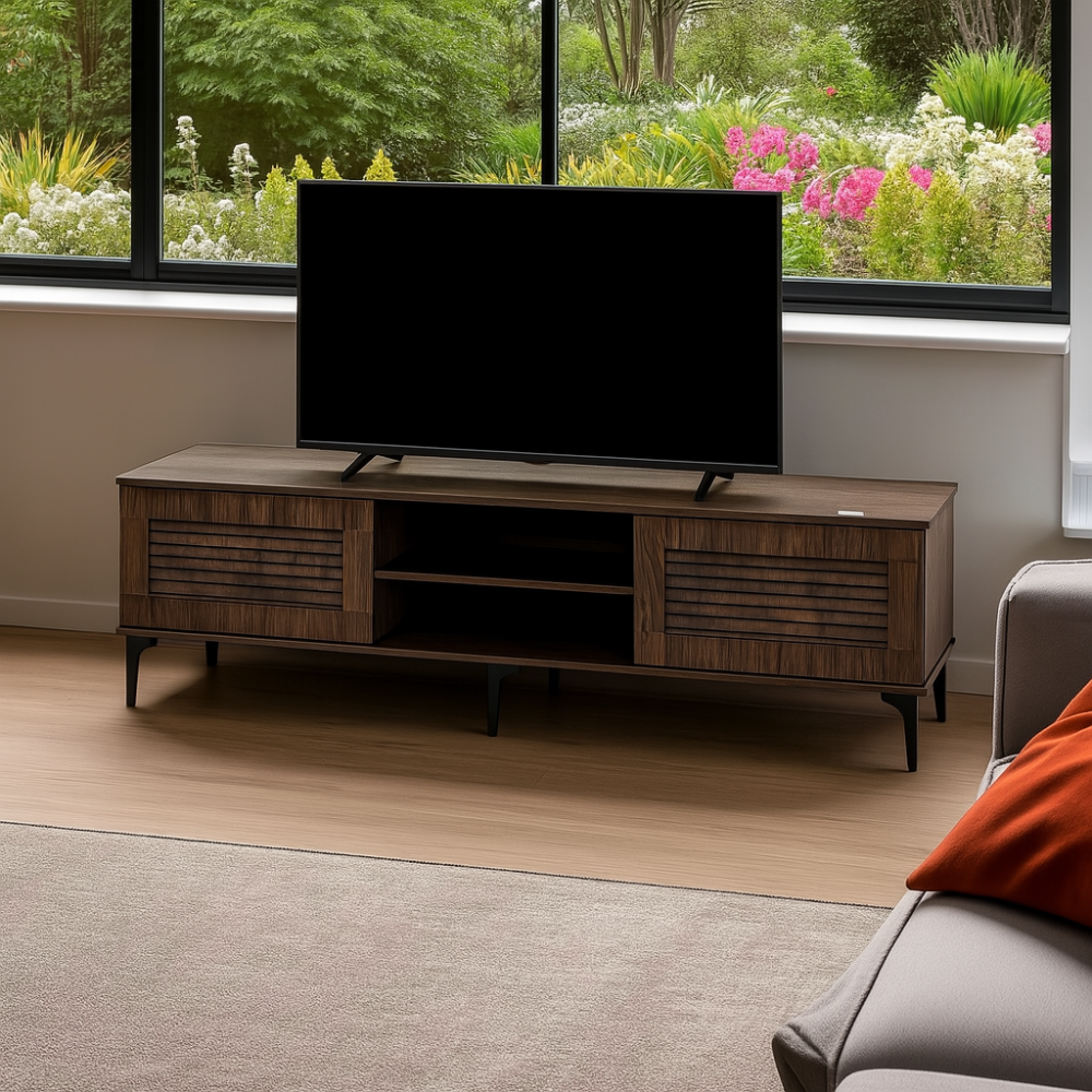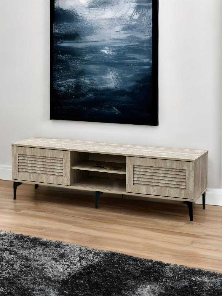 تصميمها أنيق وعملي، فيها بابين من الجهتين للتخزين ورفين بالوسط ترتب عليهم أغراضك مثل الرسيفر أو الكتب أو أي قطعة ديكور.