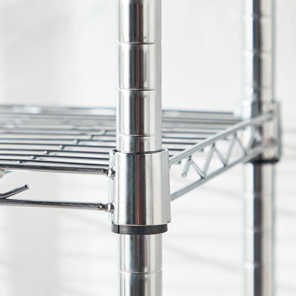رف معدني عملي مصنوع من الفولاذ المطلي بالكروم يتميز بالقوة والمتانة، مثالي لتنظيم الأدوات المنزلية أو المطبخ أو المستودع. تصميمه العصري يمنح لمسة أنيقة لأي مساحة مع قدرة عالية على التحمل.